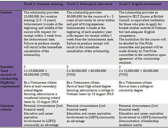 The Strive with Pride scholarship is part of Viet Pride 2013. The official application portal of Strive with Pride scholarship will open on August 2, the opening night of Viet Pride 2013.